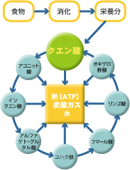 クレブスのクエン酸サイクル説です。私たちが食するでんぷん、蛋白質といった食物から消化された栄養分がクエン酸サイクルにのって円滑に循環するというもの。つまり、クエン酸を摂れば、人間の健康に最も大切なサイクル運動が得られ、体がすっきりし。健康に大いに役立つと言うわけです。